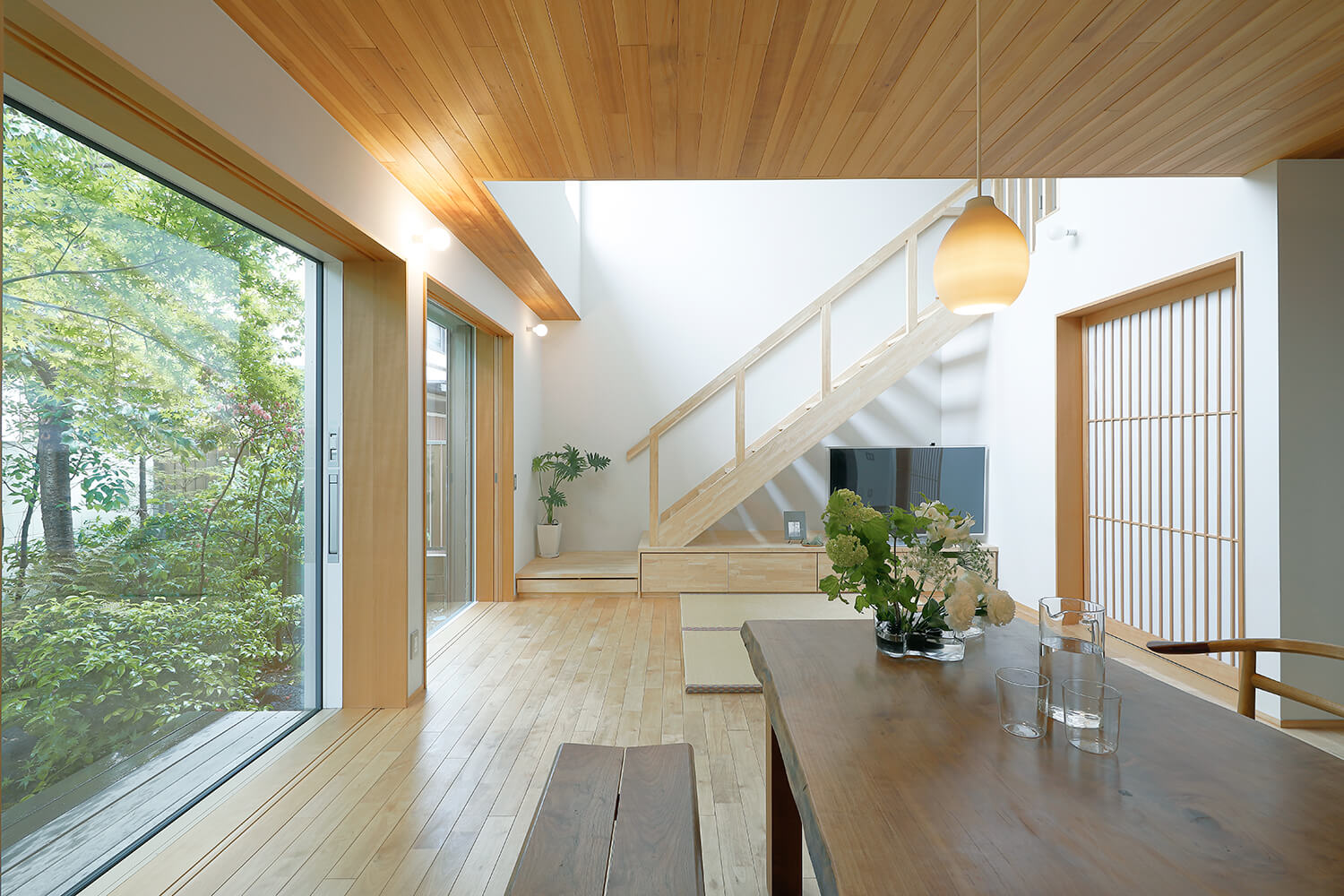 駅前の住宅地にありながら開放的なLDKが心地よいM邸は、1階が49.77㎡、2階が61.27㎡。敷地面積に恵まれている長野県では、比較的コンパクトな住宅といえるだろうが、それを全く感じさせない広がりを感じられるのが魅力だ。