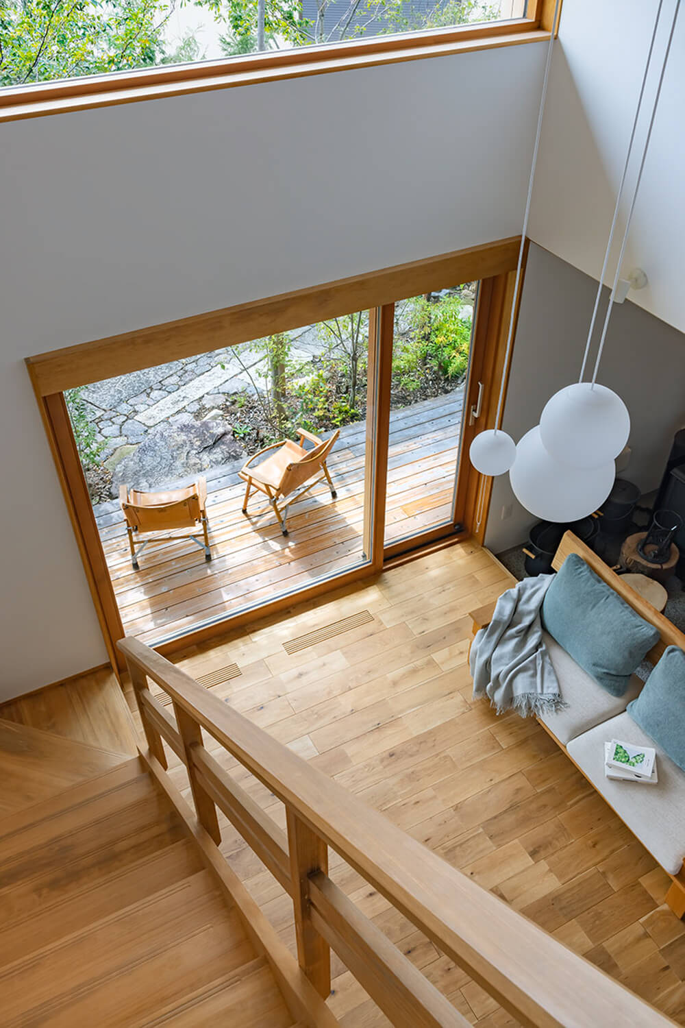 階段からオークの床のリビングを見下ろす。吹き抜けの高さは約5mある。夏場には深い軒が室内に入る日差しの量を調整することで、LDKは程よい明るさになる。