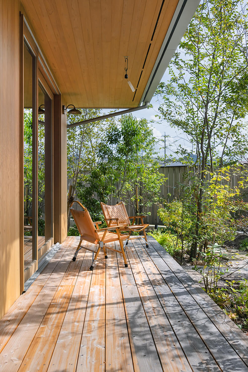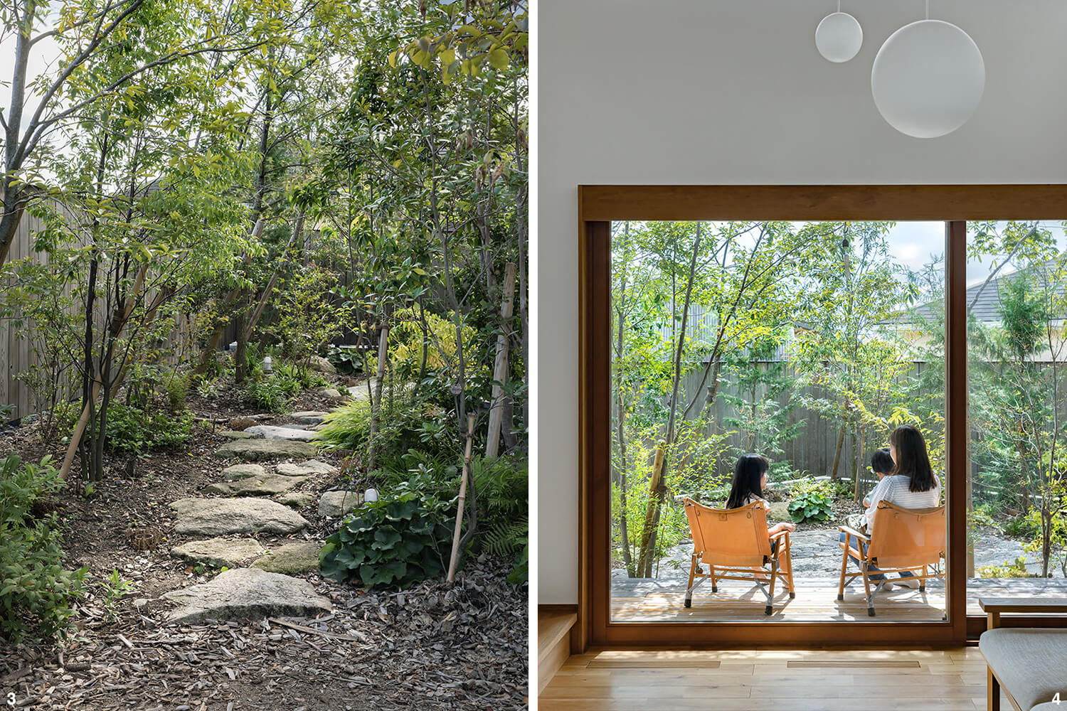 3.ダイニングの裏手に位置する庭の眺め。飛石を配して、林の小道を想像させる詩的な空間に。/4.ウッドデッキでくつろぐ奥さまと子供たち。近隣からの視線を遮るように庭を設けており、のびのびと過ごせる。