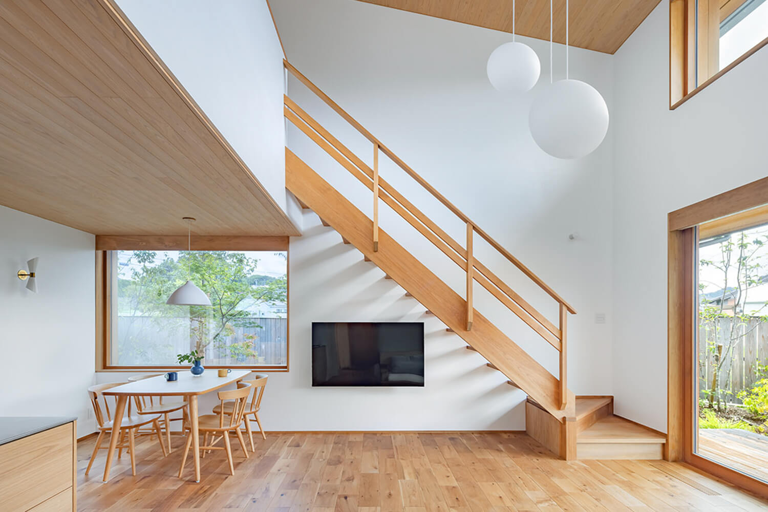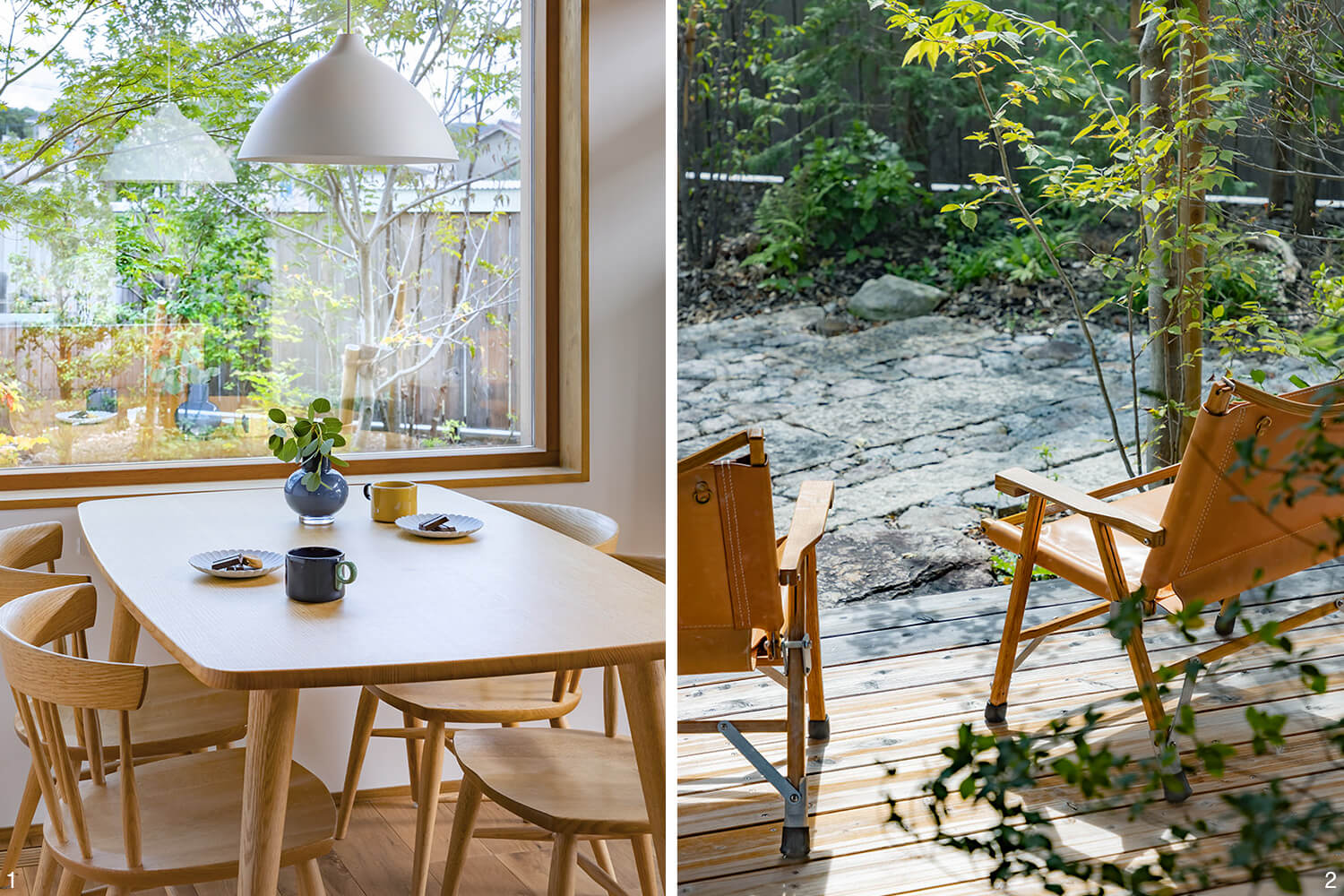 1.家族が集う場所であるダイニングにも大きな窓を設けた。目隠しのために窓の外に植えたグリーンが、家族を癒やす景色としての役割も担う。/2.ウッドデッキのテラスの先に石畳のスペースを設けた。子供たちは庭に出て遊ぶことも多く、元気な声が響きわたる。