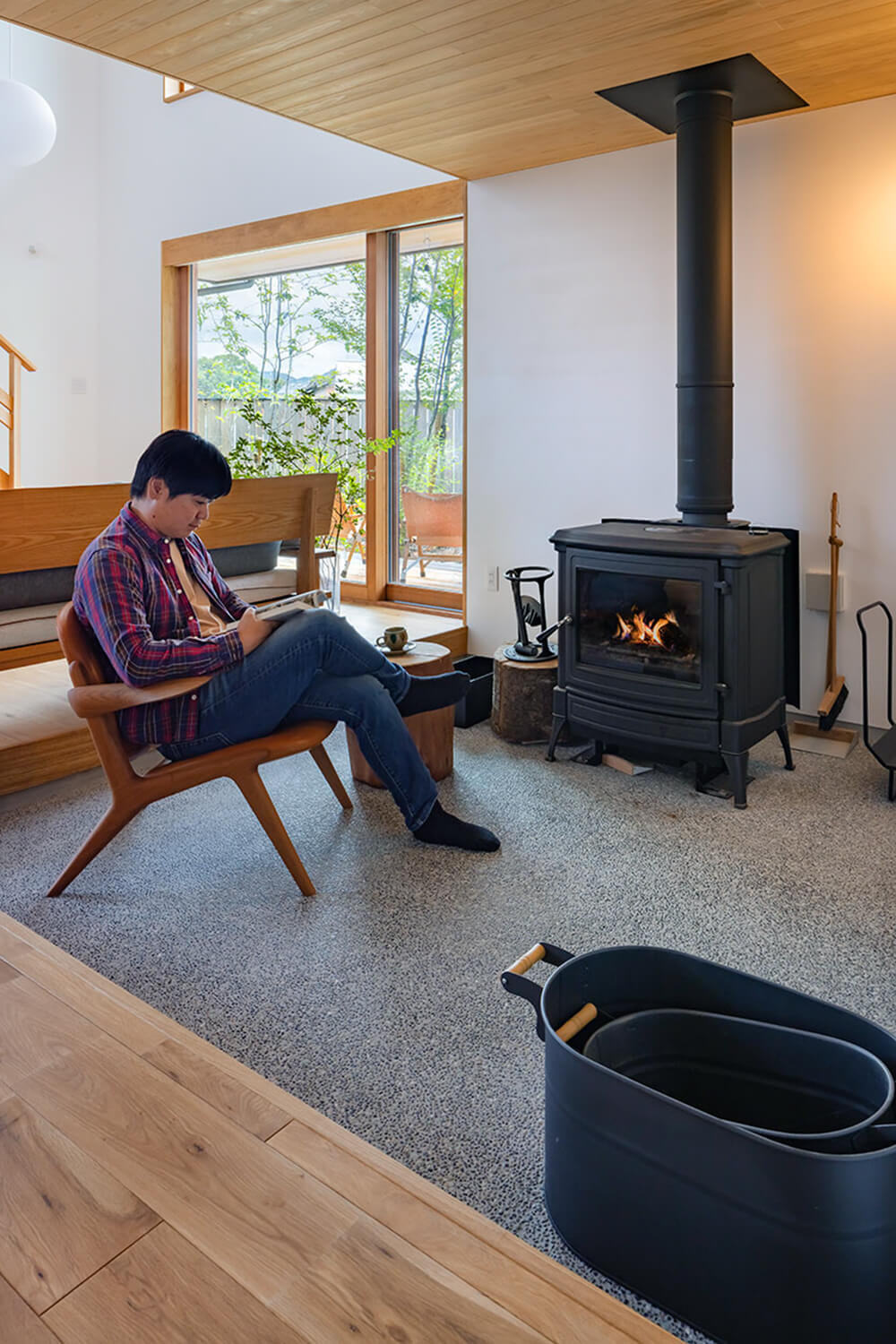春夏は庭の緑を、秋冬は薪ストーブの炎を。一年中、心地よく、安全な家