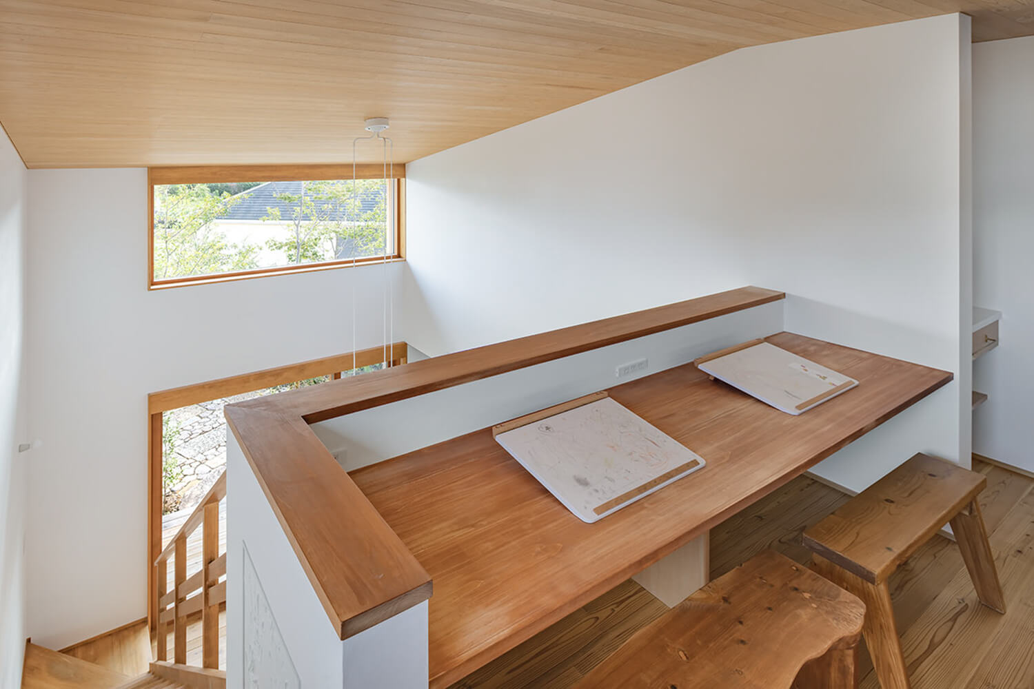 吹き抜けの脇に設えられたスタディスペース。ここで勉強する子供たちも、1階にいる両親も、吹き抜けを介してそれぞれの気配を感じ取ることができる。