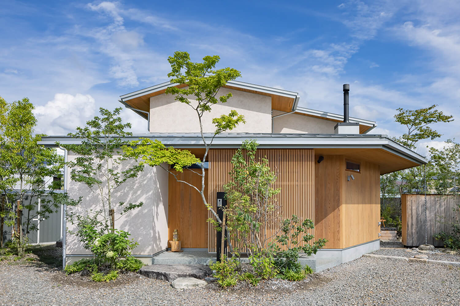 夏は深い軒の先に広がる庭の木々が直射日光を遮り、冬は薪ストーブの炎が家全体を優しく暖める。愛知県の田園風景が広がるエリアに立つK邸は、考え抜かれた温熱環境設計によって一年中、快適に過ごせる家だ。