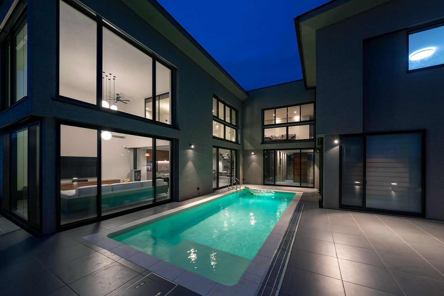 中庭にある7mのプール。ライトアップされると、幻想的なアートのように存在感を増す。正面玄関から両翼にパブリックスペースとプライベートスペースが伸びる。