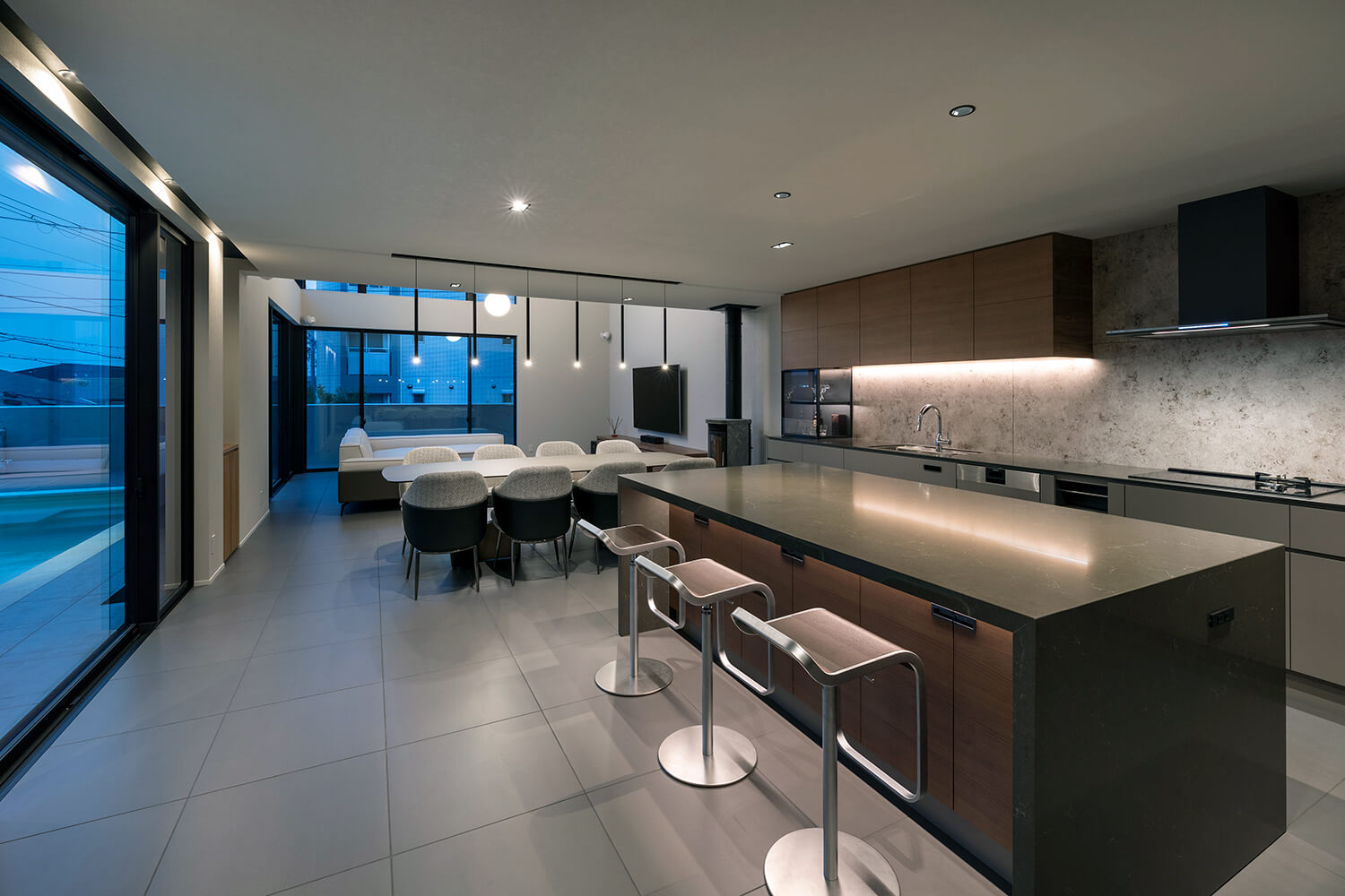 パブリックゾーンである南棟のリビングは2階まで吹き抜けがあるダイナミックな空間。ソファセットやスタイリッシュなアイランドキッチンがラグジュアリーな雰囲気をつくり上げる。床やプールのあるテラスには同色のタイルを張り、屋内外がシームレスにつながるよう意識した。音響設備にもこだわり、前後左右のスピーカーに加え、その間や上部にも設置し、映画館と同じような臨場感のあるシステムに。「部屋のなかだけではなく、屋外のテラスにいても音楽や映像を楽しめて、とてもよいですね」とOさん。