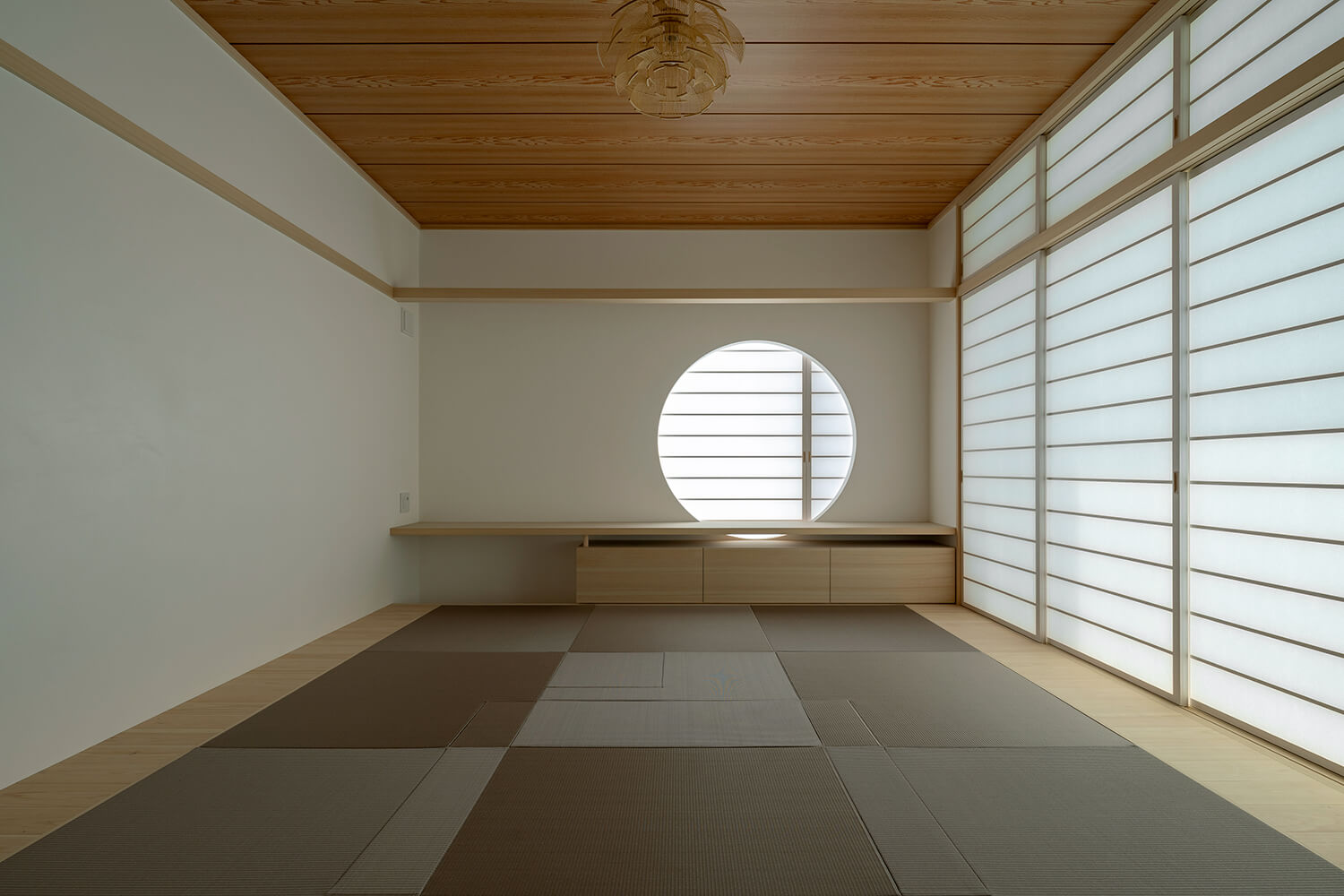 玄関を右手に進むとプールに面した場所にゲストルームを兼ねた和室がある。茶道をたしなむ親子のために炉畳を取り入れた。ゲストをお茶でもてなすことも。