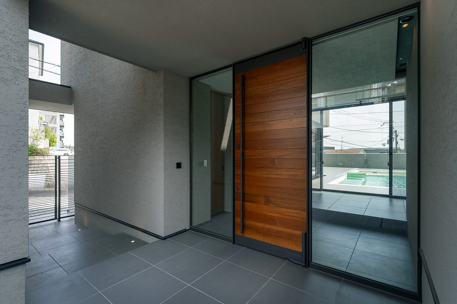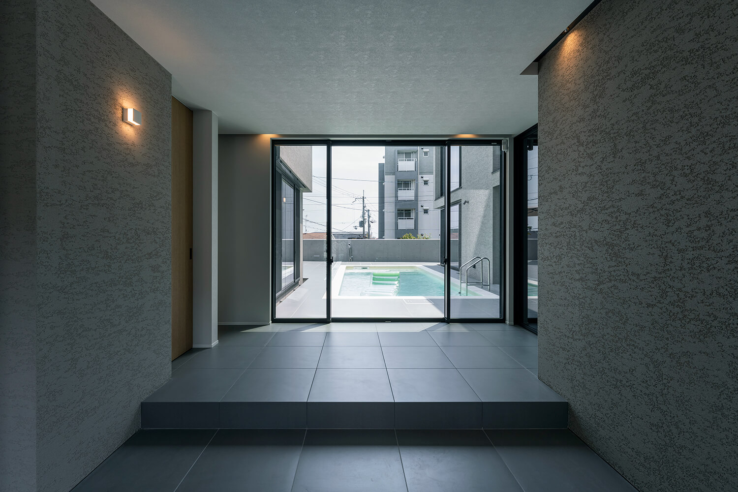 玄関の扉を開くと視界にプールが。夏は涼やかに、それ以外の季節にも水盤として存在感を放つ。