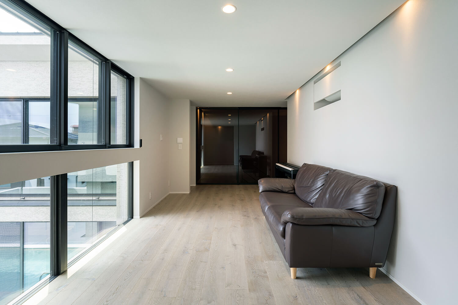 LDKやパブリックゾーン棟側の全面を開口とする寝室もオープンな空間だ。寝室から階下のリビングや向かいの棟を見渡すことができる仕立てになっている。「O邸では、テラスへの視線を遮る壁を計画する必要がないSE構法が非常に効果的でした。開放感と広がりのある空間を実現できました」と髙木さん。2つの棟をつなぐ2階の廊下の大開口からもプールの眺めを楽しめて、視界が180度広がっていく。ここには書庫を設け、テラスを見下ろしながら、読書を楽しめるセカンドリビングも用意した。