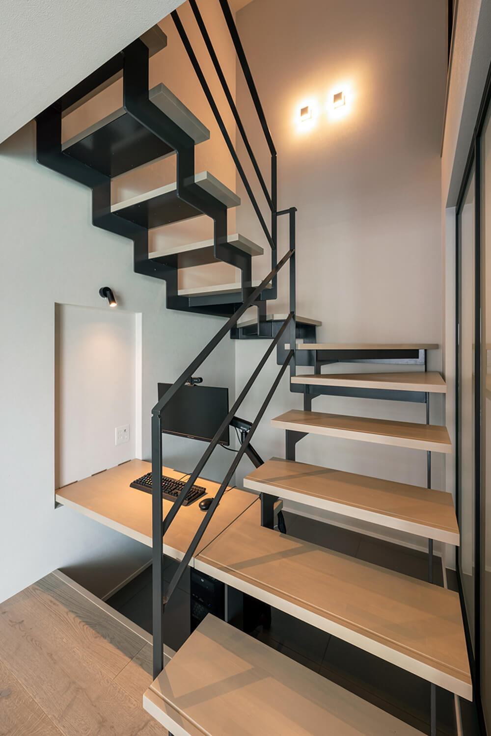 ダイニング脇の階段下には折り畳み式のデスクを設置し、空間を有効利用している。先が見通せるスケルトン階段が軽やか。