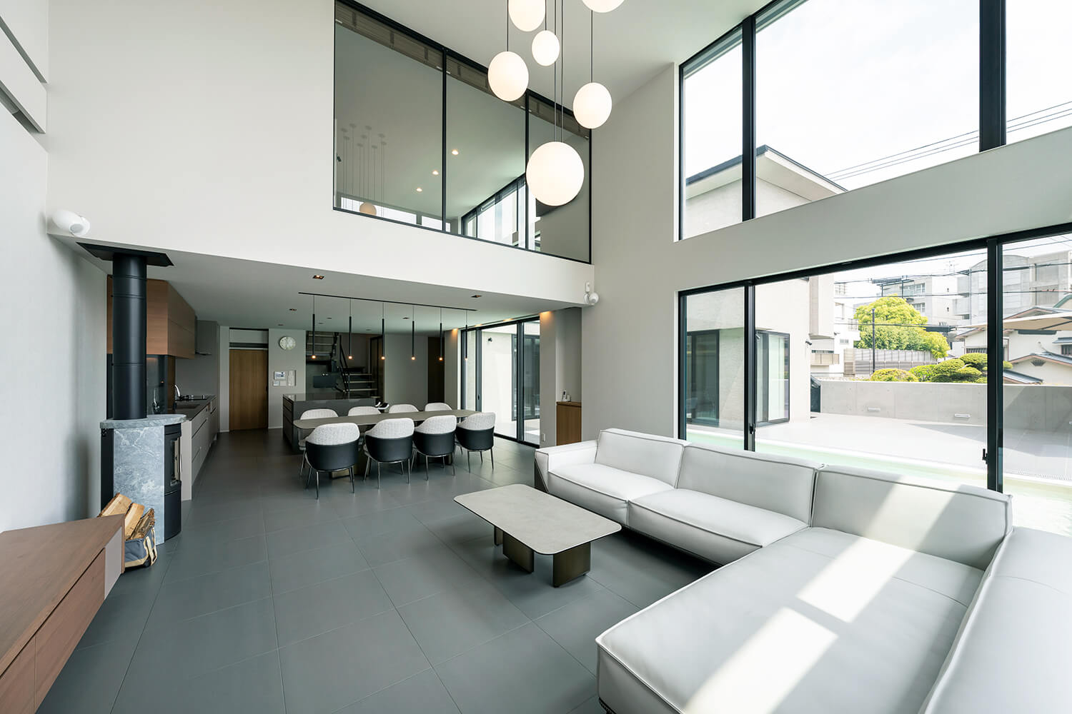 白とグレーを基調としたシックなダイニングキッチン。モダンな空間を黒色が引き締めている。手前は、ソープストーンの質感がエレガントなHETA社の薪ストーブ。
