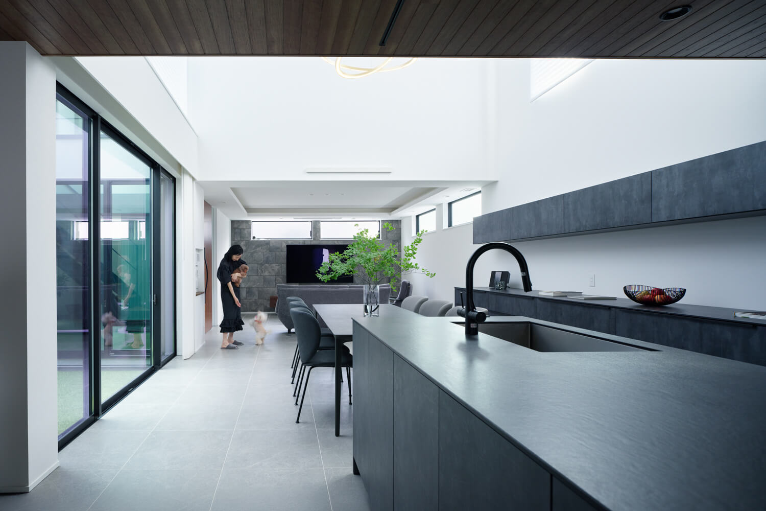 耐震性とインナーガレージの確保に加えて、夫妻が望んだのは「家族全員がリラックスでき、愛犬にとっても安心できる家」であること。その思いを受けて、自身も愛犬家であるKURASUの小針美玲さんが設計を手掛けた。まず、人も犬もお互いの気配を感じながら過ごせるよう、LDKは一直線に伸びる細長い空間に。出入り口の扉のサイドにはガラスを採用し、視線が抜けるように工夫している。料理をしながら家族と会話ができ、愛犬からも家族の居場所がわかるように、キッチン、パントリー、奥さま用の小スペースをひとつながりに配置し、できるだけ死角をつくらないよう工夫している。さらに、全館空調によって一年を通して快適な温度を保ち、犬のケージ周辺にも床暖房を設置し、床材は汚れを落としやすいタイルを採用している。まさに、人も犬も同じ目線で心地よく暮らせる家を目指した設計なのだ。