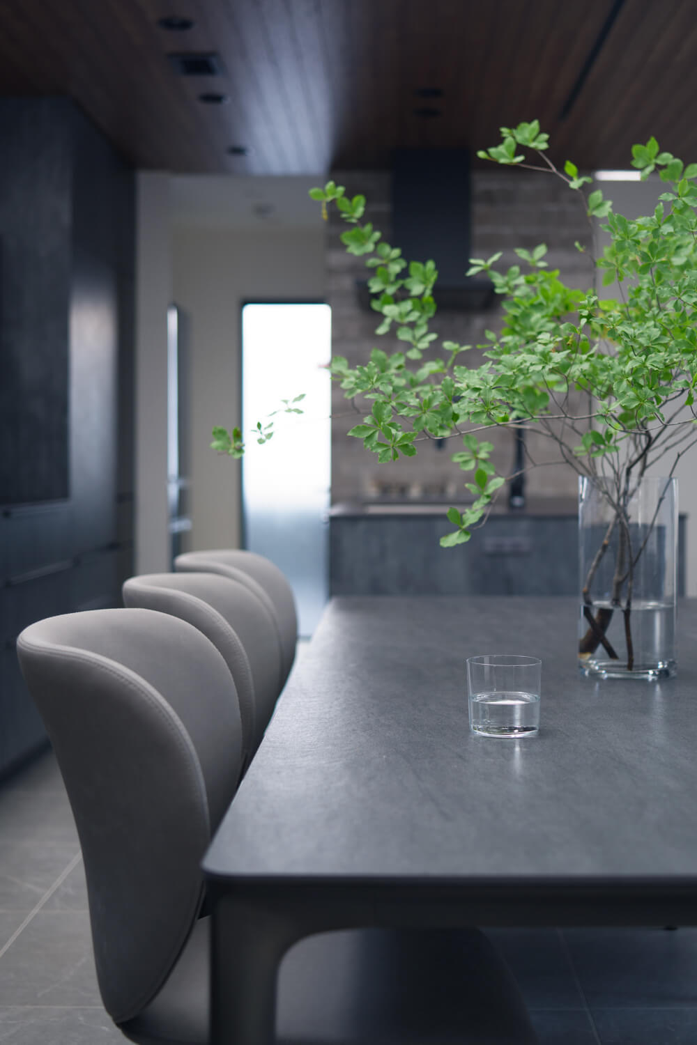 外観とインテリアは、ご主人の好みを反映した。大人が落ち着いて暮らせる家を目指し、グレーとブラウンを基調にマチュアなデザインを追求。家具はほとんど造作で、キッチンからリビングまで続く大きな収納はキッチンハウスにオーダーした。「ラインをそろえて色を統一することで、暮らしの景色がすっきり整いました」と奥さまが話すように、サッシや床タイルの割り付け、収納の取っ手の位置に至るまで、家全体が美しく整えられているのが印象的だ。ほかにも、シックな浴室、収納たっぷりのパウダールーム、家事を行うランドリールームをまとめることで、「入浴・着替え・洗濯」のすべてが同じ空間で済むように。考え抜かれた家事動線にすることで、快適な暮らしを実現している。