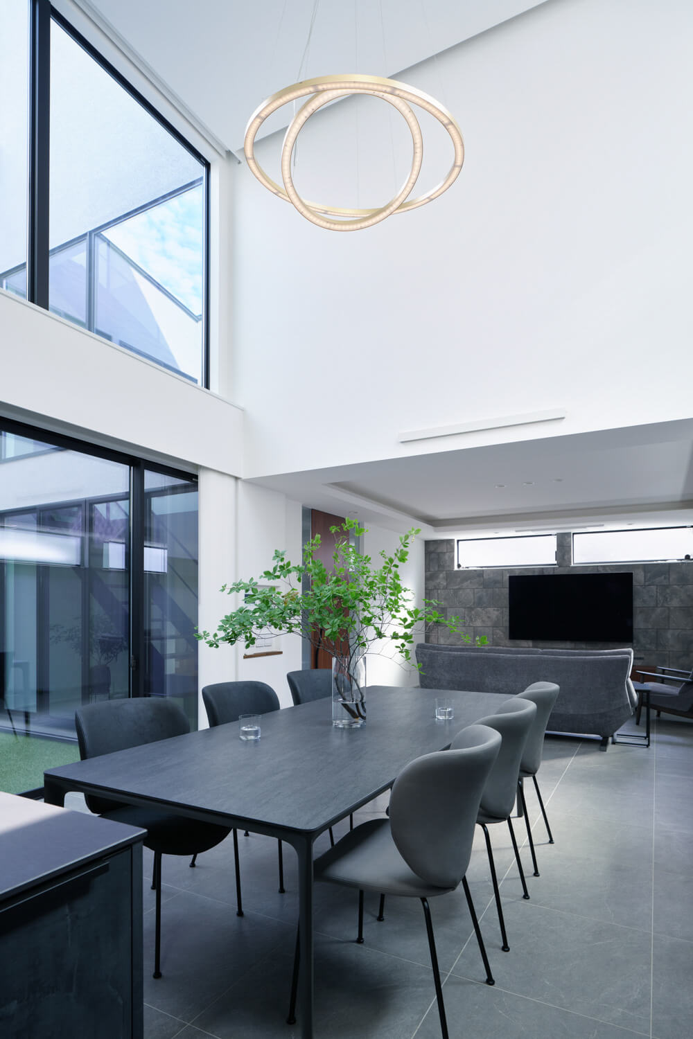 中庭に面するLDK中央に天井高5.5mを超える吹き抜けを配した。円形のペンダントランプがアクセントに。南側のハイサイドライトからの光が室内を明るく照らす。