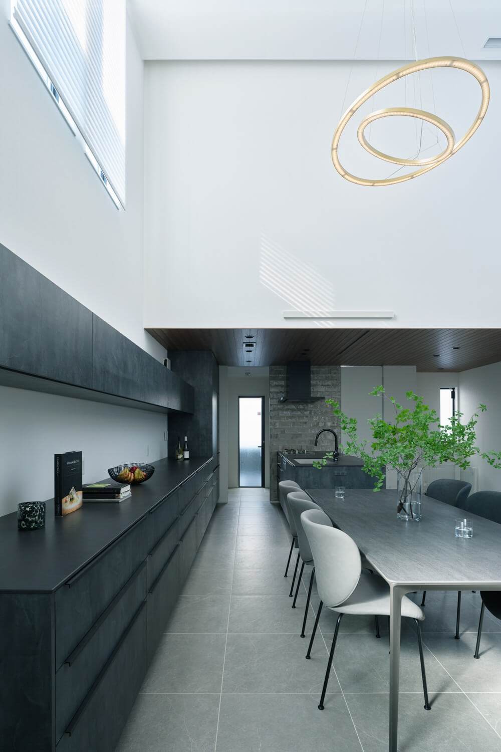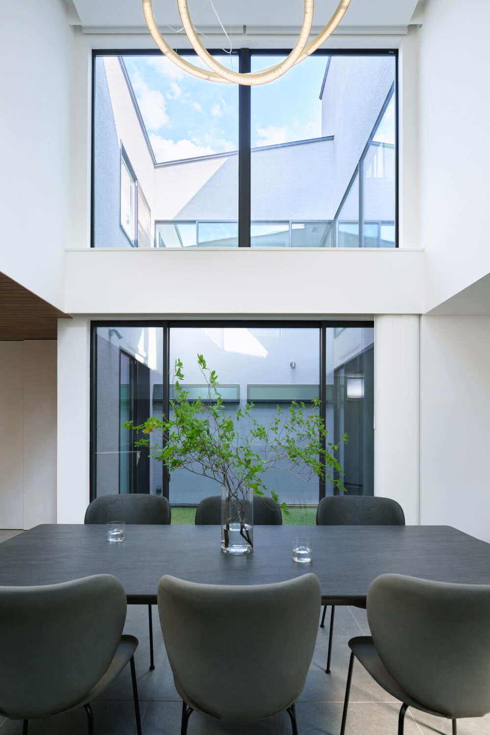 光と風を取り入れられるだけでなく、モノトーンで統一したLDKに大きな開放感をもたらしてくれる存在の中庭。ダイニングに座ると、高窓から空へと視線が抜ける。