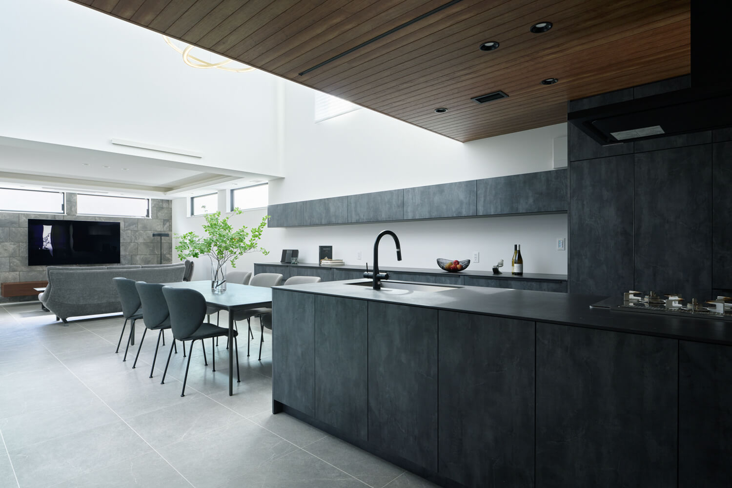 LDKは柱のない大空間で、吹き抜けの天井高は約5.5m。家づくりを始めて、「地震に強く、柱を少なくしても開放的な空間をつくれる構法」を探すなかで、ご主人がSE構法にたどり着いたことで、ダイナミックな空間を実現できた。「夫は建物内部に愛車を収めるビルトインガレージを希望していました。建物の構造的な強さと自由なプランニングを両立できると知って、SE構法で家づくりをすることに決めました」と奥さま。自由なプランニングをスタイリッシュなデザインに落とし込める設計施工会社を探して出合った「KURASU」に家づくりを一任した。