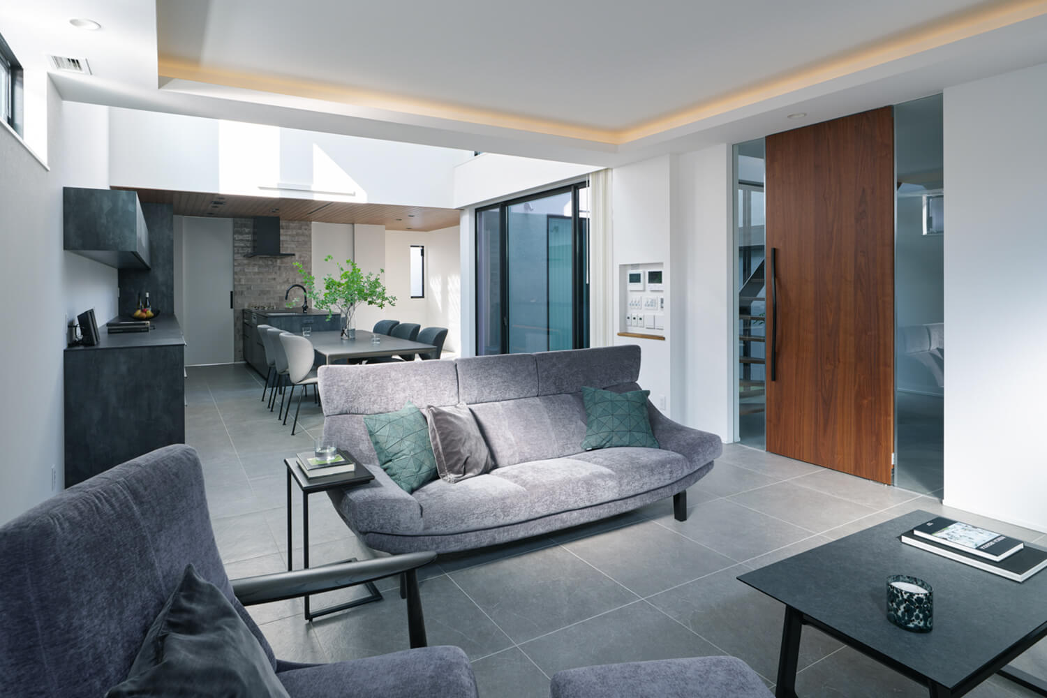 グレーのソファセットを置いたリビング。LDK入り口の一部をガラスにし、玄関ホールの様子がわかるように。愛犬が帰宅した家族をガラス越しに出迎えてくれる。