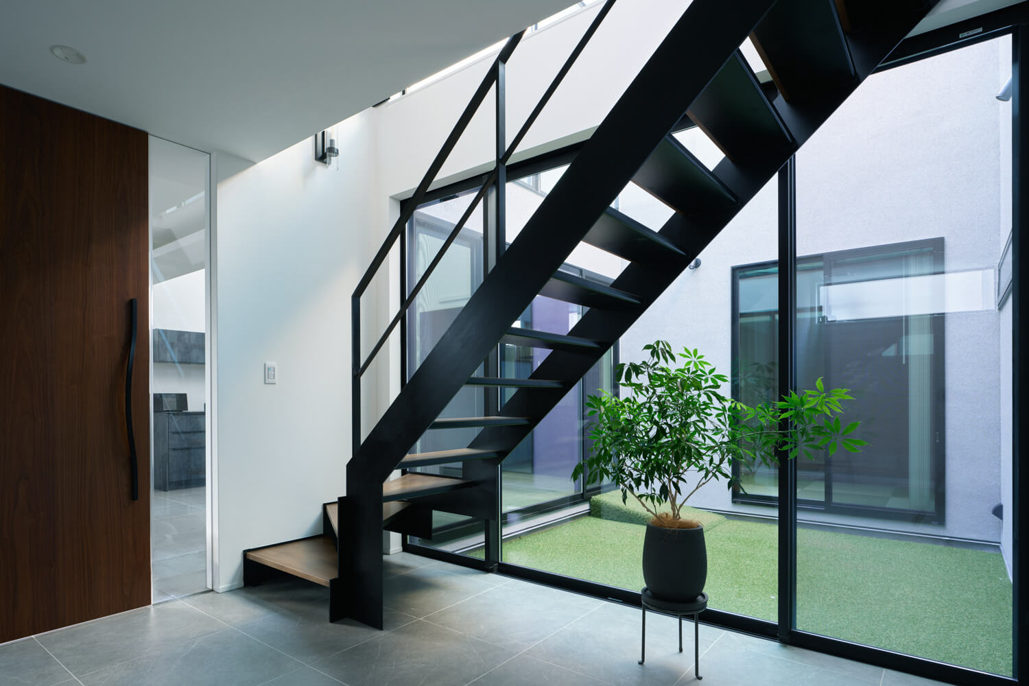 玄関ホールにも中庭からの光が入る。ガラスをサイドに配した扉やスケルトン階段を採用し、中庭から建物内全体に光がまわるようにした。