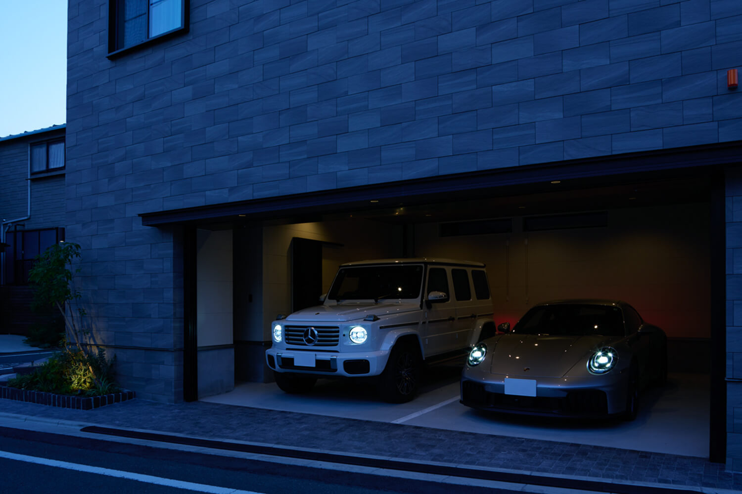 ビルトインガレージ。広々としたガレージを柱なしでつくることができるのはSE構法ならでは。