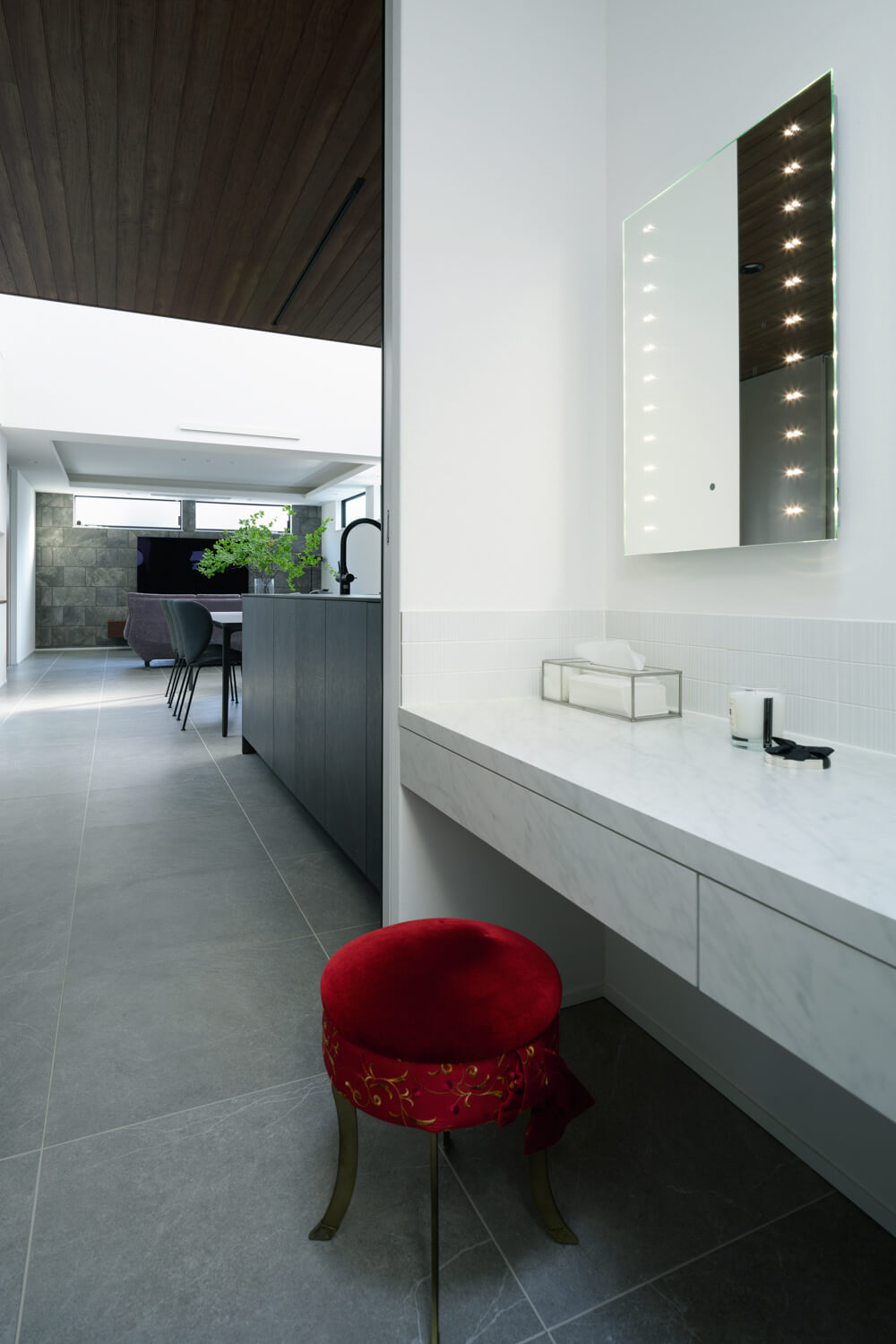 キッチンに隣接する、奥さまがメイクや作業をするための家事コーナー。家族のもとに自然と集まってくる愛犬がのびのびと過ごせるよう、床には汚れが落としやすいタイルを採用。