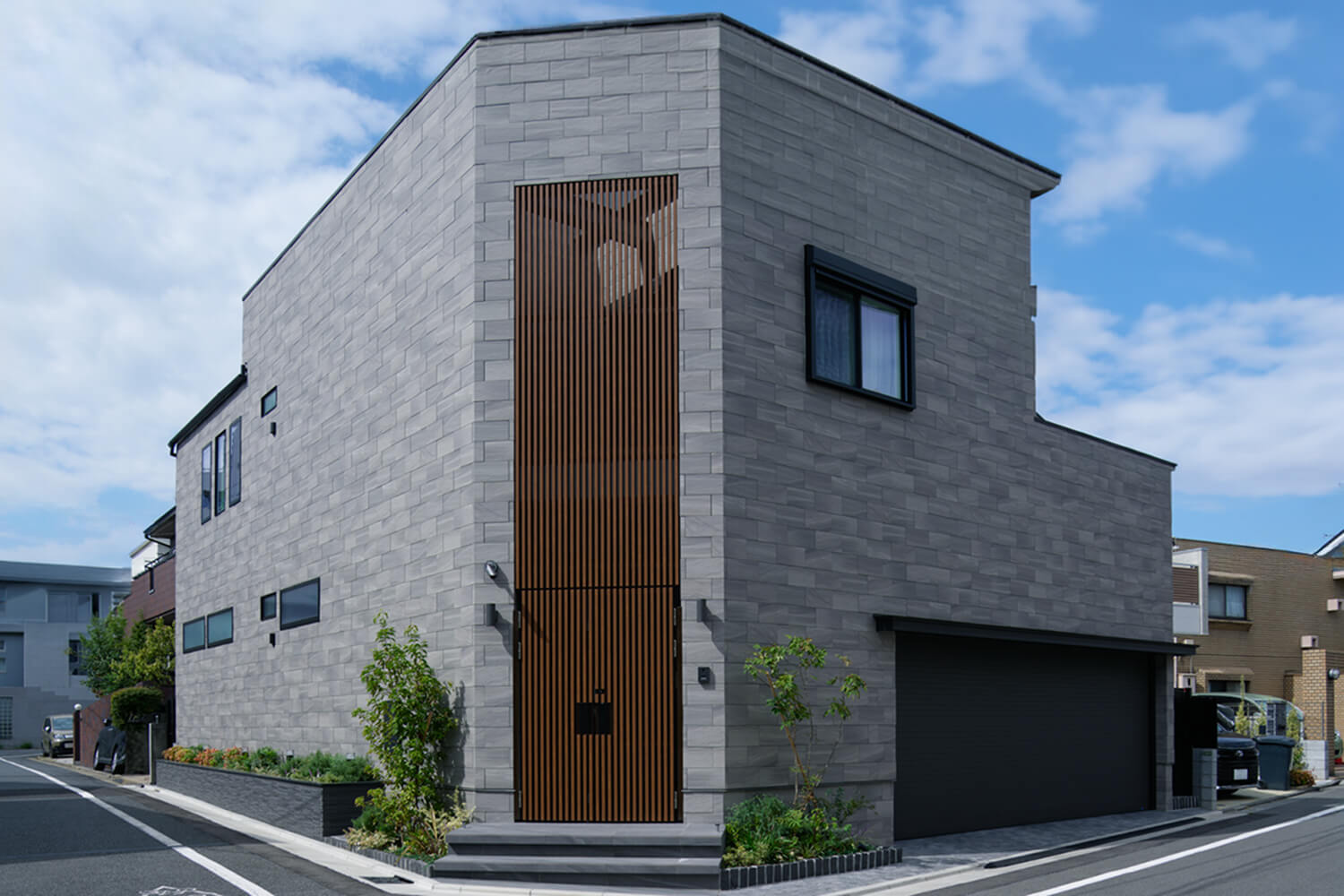 角地に立つK邸外観。玄関前にウッド調の格子扉を設置し、表通りからは家のなかが見えないように。都心に立つだけに、プライバシーと防犯に配慮した。