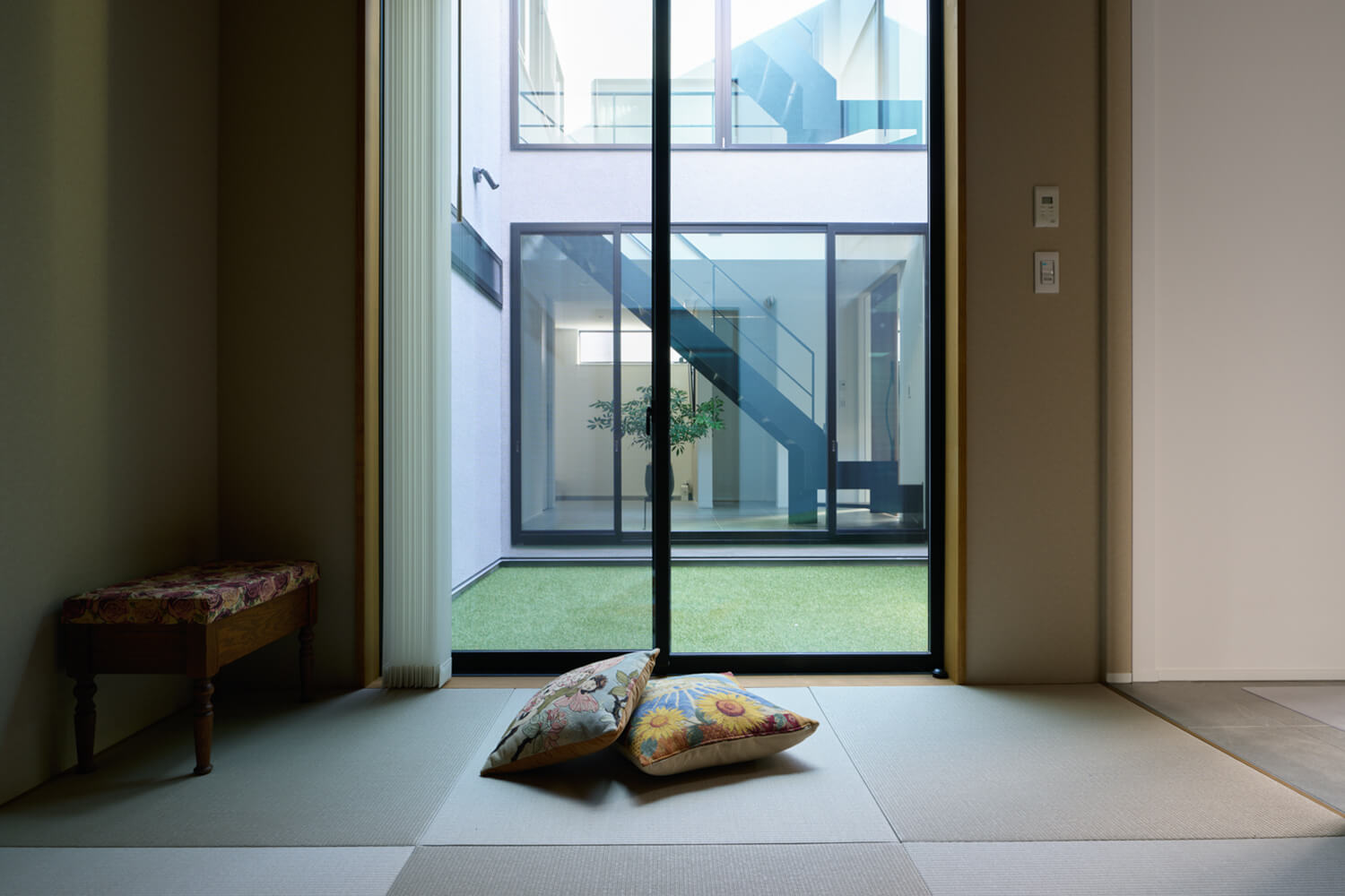 落ち着いたグレーのタイルとウッド調の格子扉が印象的な外観のK邸は、東京都心にある住宅街の角地に立つ。人や車の往来のある道路に面する外壁に、大きな開口部は見当たらない。だが、格子扉の先の明るさを抑えたポーチを抜けて玄関を入れば、そこには中庭からの柔らかな光が差し込んでいる。光と風を中庭から取り込む、内に開いた住まいだ。