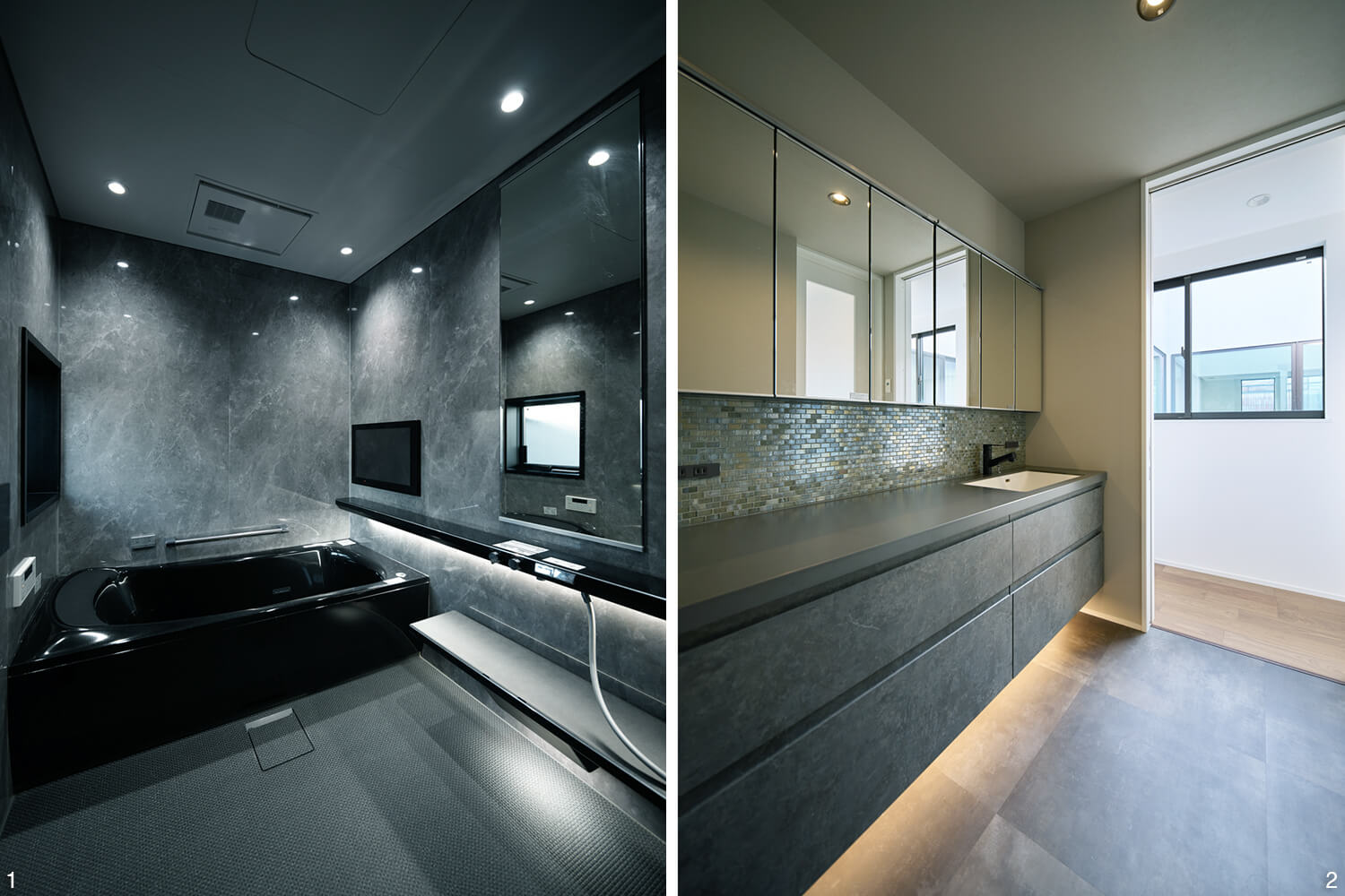 1.2階に配したダークグレーを基調としたバスルーム。ご主人のお気に入りの場所だという。/2.バスルームにつながるパウダールームには大容量の収納を設けている。洗面道具やメイク道具など、ほとんどのものをしまえるように工夫。パウダールームに隣接させて洗濯・乾燥室と衣類の仮置きスペースを用意した。