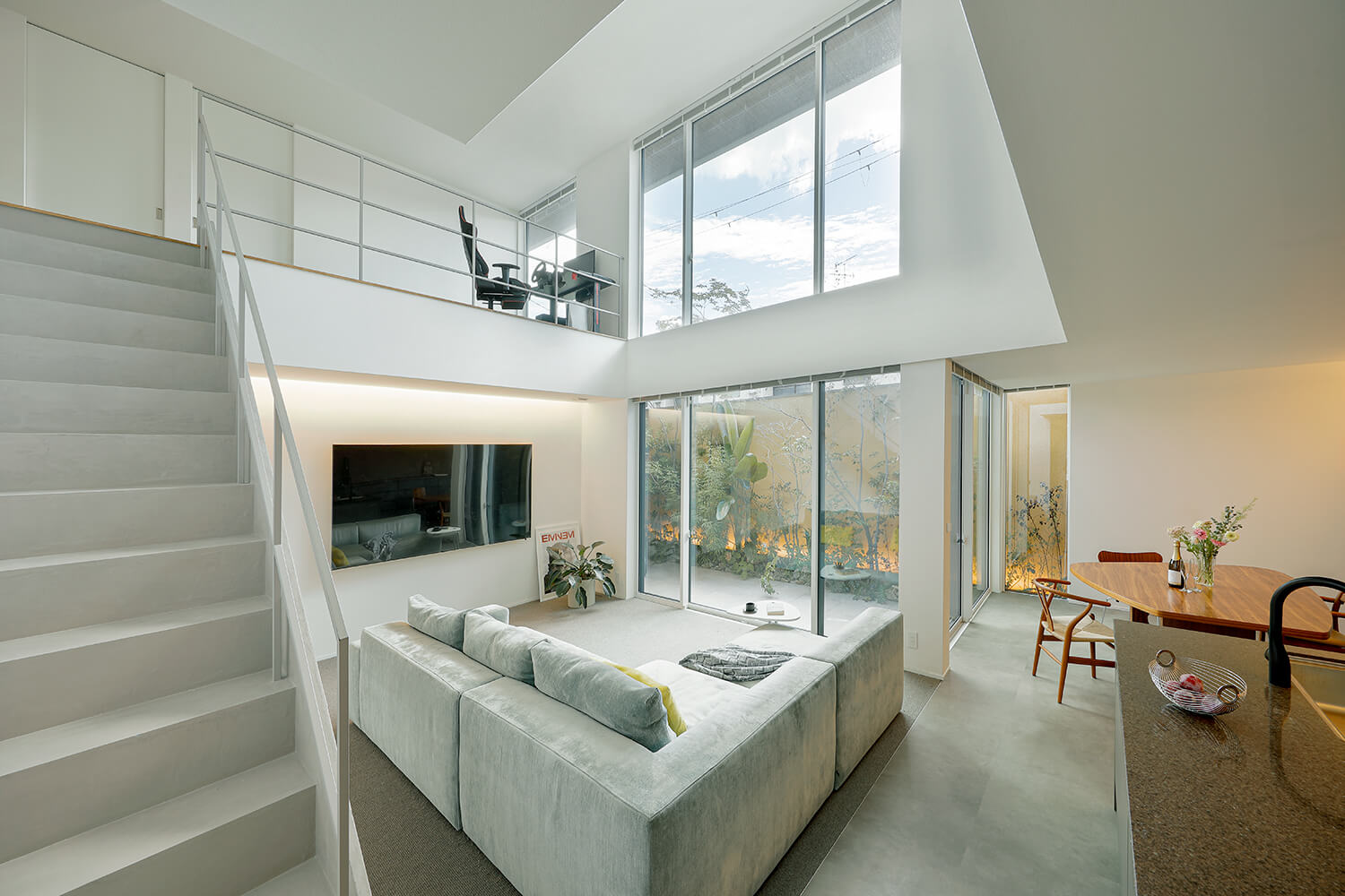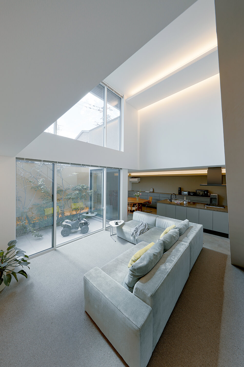 5.5mある吹き抜けに面した大開口から空を仰ぐことができて、屋外のテラスとシームレスにつながるリビング。天井に仕込んだライン状の間接照明がスタイリッシュ。