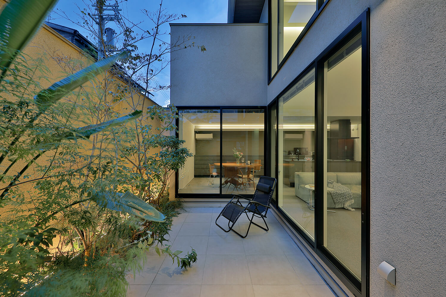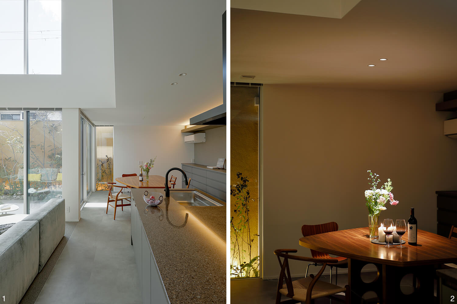 1.リビングに設けた上下の開口に加え、ダイニング側やスリット窓からも光を取り込み、LDKを明るくキープ。窓越しにテラスの植栽が視界に入り、広がりが感じられる。/2.夜になると、ダウンライトの光がダイニングテーブルを照らし出し、ドラマチックな雰囲気に。テラスのグリーンもライトアップされ、家全体が非日常的な空間となる。