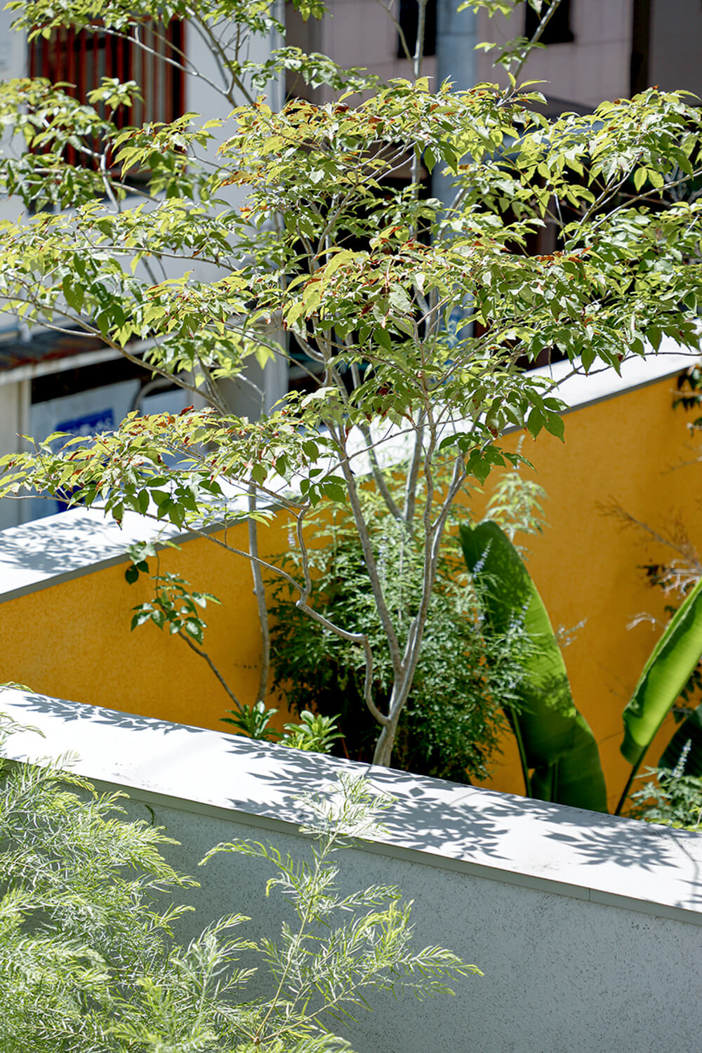 住宅に隣接しているため、外壁はプライバシーを守れる高さを計算して設計。テラス内側は植栽が映えるマスタードイエローにした。