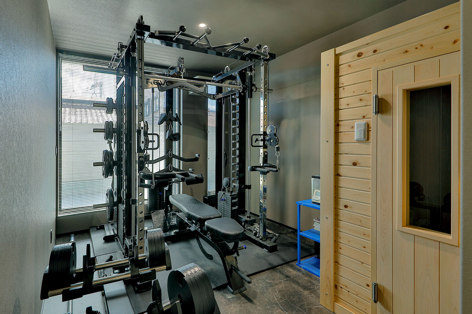 本格的なサウナを設置した2階のプライベートジムはKさんのお気に入りの場所。奥にあるルーフバルコニーに出て、外気浴で整うことも。