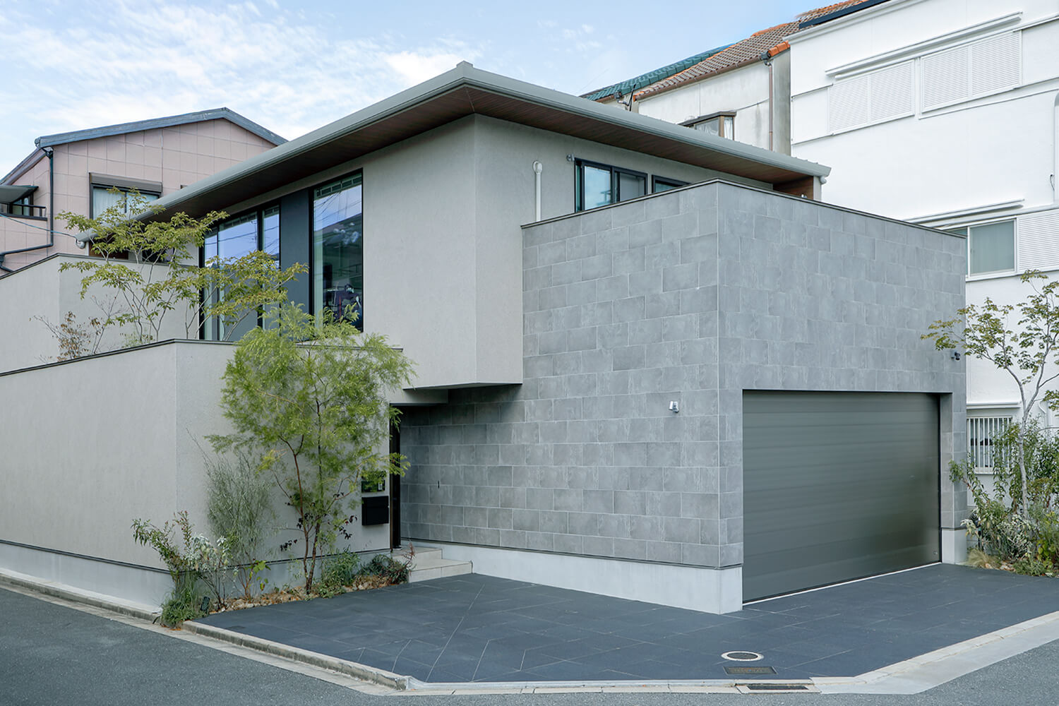 南東角地のため日射取得にも恵まれ、パッシブデザインに最適なロケーション。立体感をもたせたファサードにし、壁面にタイルを使用してモダンなガレージハウスに仕上げた。