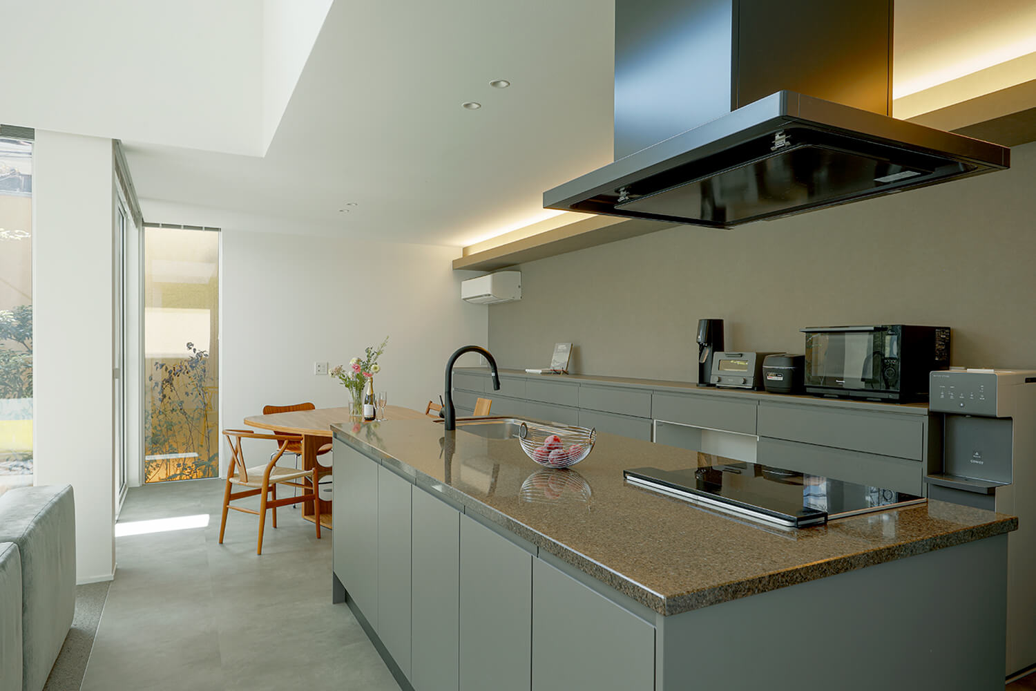 Kさんが要望として挙げたのは、「大きな吹き抜けがあるLDK」「余裕のある収納」「愛車のランボルギーニを保管するビルトインガレージ」の3つ。タイコーアーキテクトの設計担当の前田 良さんは、これらを軸に住宅の機能性とデザイン性の両立を目指した。隣地との境界にあるテラスには高い壁を立ててプライバシーを守りつつ、LDKの吹き抜けの壁面に大開口を設け、室内全体に十分な自然光を取り込む。