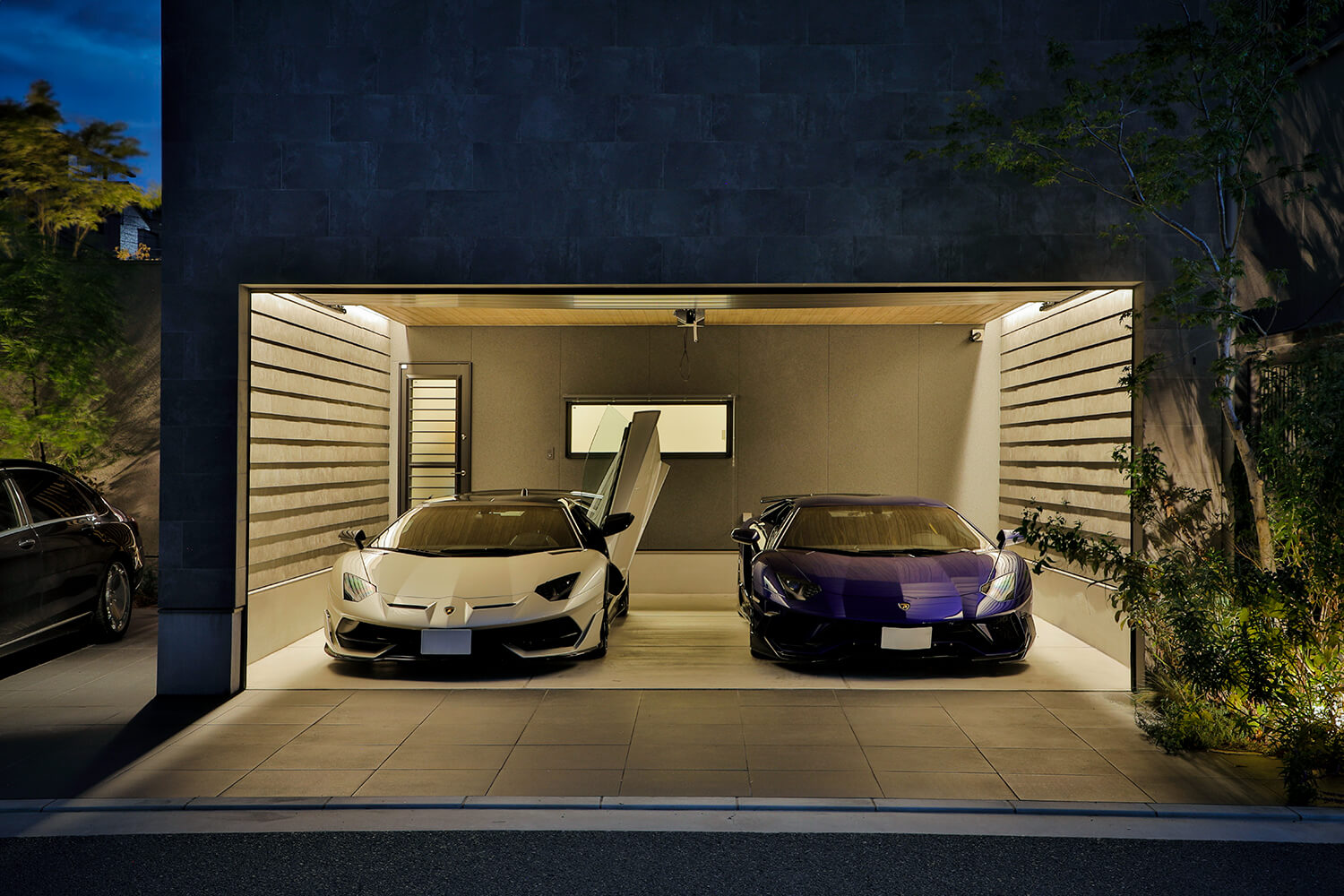 ビルトインガレージは愛車のランボルギーニのアーティスティックな曲線が際立つ照明計画に。ガレージからも玄関へとアクセスできる裏動線を設けた。