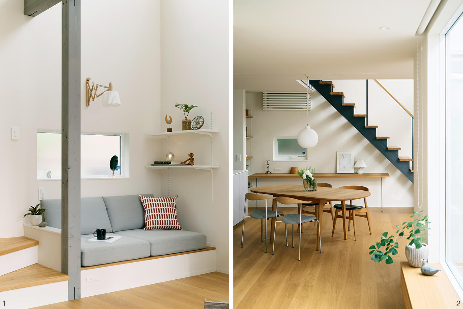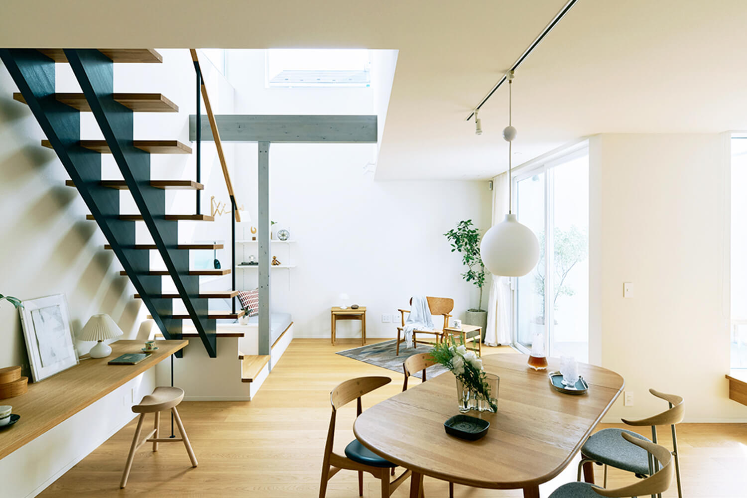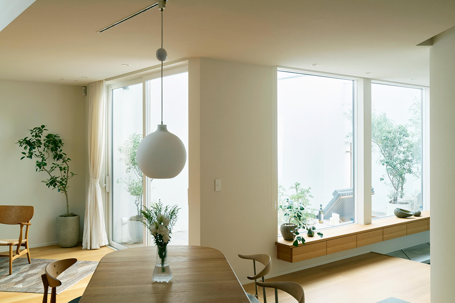 なかでも1階の玄関からシームレスにつながったLDKは、どこにいても中庭を望むことができるパノラミックな眺めが魅力。過ごす定位置を決め込まず、自由に選べるよう、居場所を散在させてある。北欧デザインの木の椅子を置いたリビング、ダイニングスペース、クッションを並べたこぢんまりとしたヌック。さらには、階段下のスタディスペース、玄関に面する窓辺のベンチ。白い壁に囲まれた中庭も過ごすための場所。ひと続きの空間のなかに用意された多彩な居場所は、家族それぞれが好きなようにくつろぎながら会話することも、程よく距離をとり個々に集中することも、大勢が集うことも、快くおおらかに受け入れてくれるのだ。
