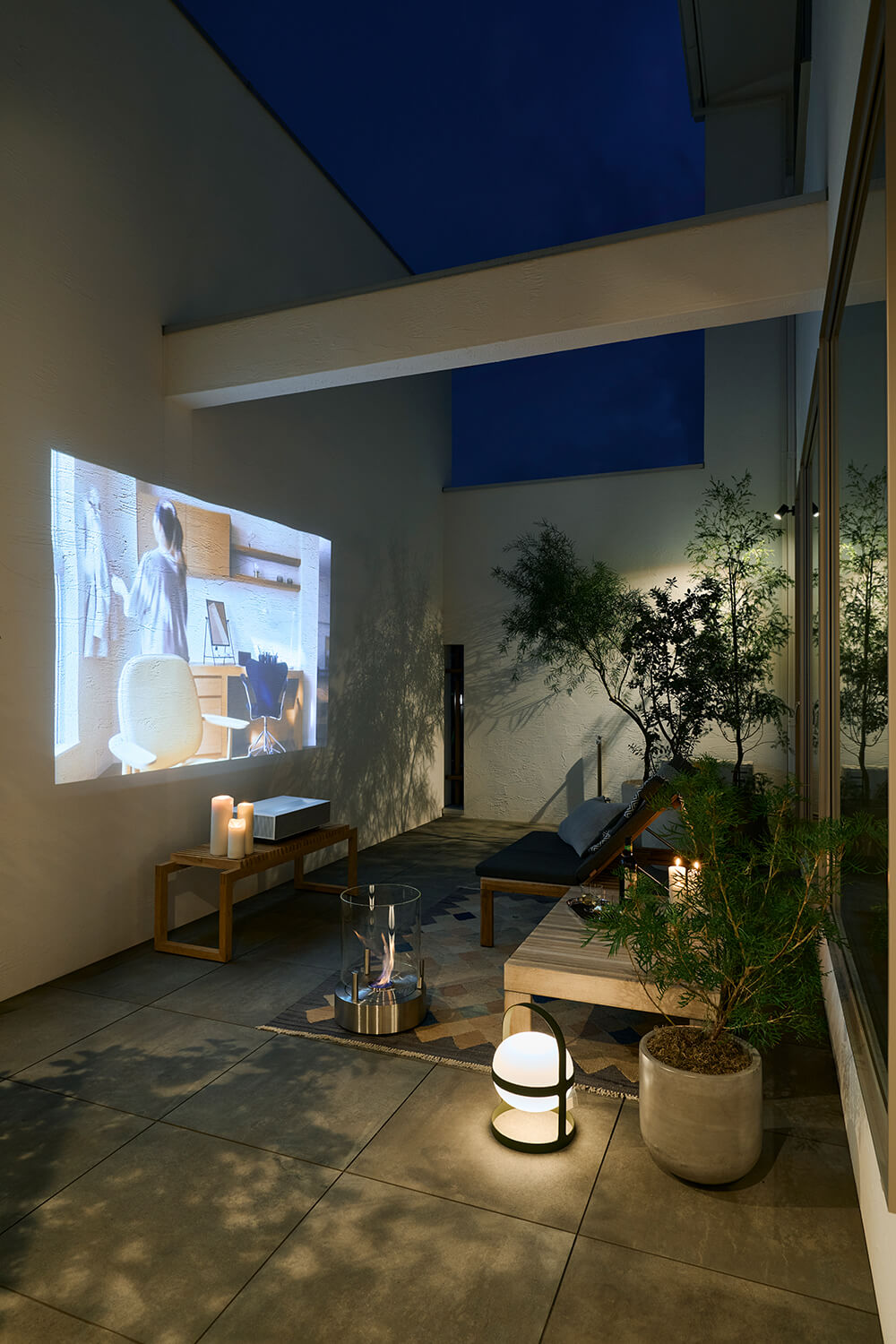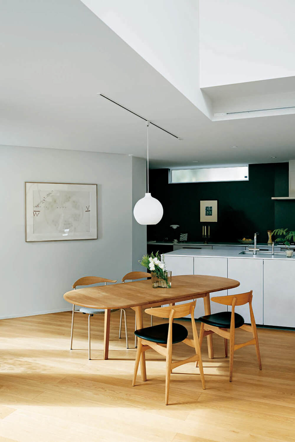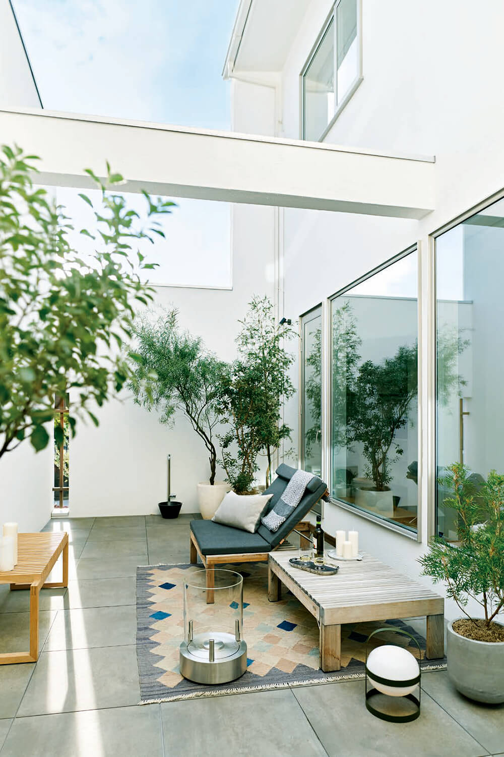 なかでも1階の玄関からシームレスにつながったLDKは、どこにいても中庭を望むことができるパノラミックな眺めが魅力。過ごす定位置を決め込まず、自由に選べるよう、居場所を散在させてある。北欧デザインの木の椅子を置いたリビング、ダイニングスペース、クッションを並べたこぢんまりとしたヌック。さらには、階段下のスタディスペース、玄関に面する窓辺のベンチ。白い壁に囲まれた中庭も過ごすための場所。ひと続きの空間のなかに用意された多彩な居場所は、家族それぞれが好きなようにくつろぎながら会話することも、程よく距離をとり個々に集中することも、大勢が集うことも、快くおおらかに受け入れてくれるのだ。