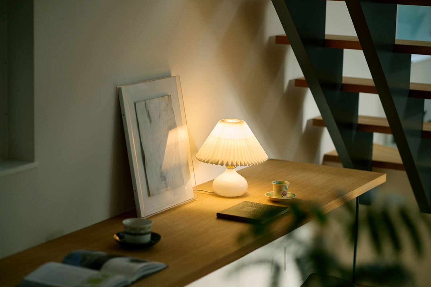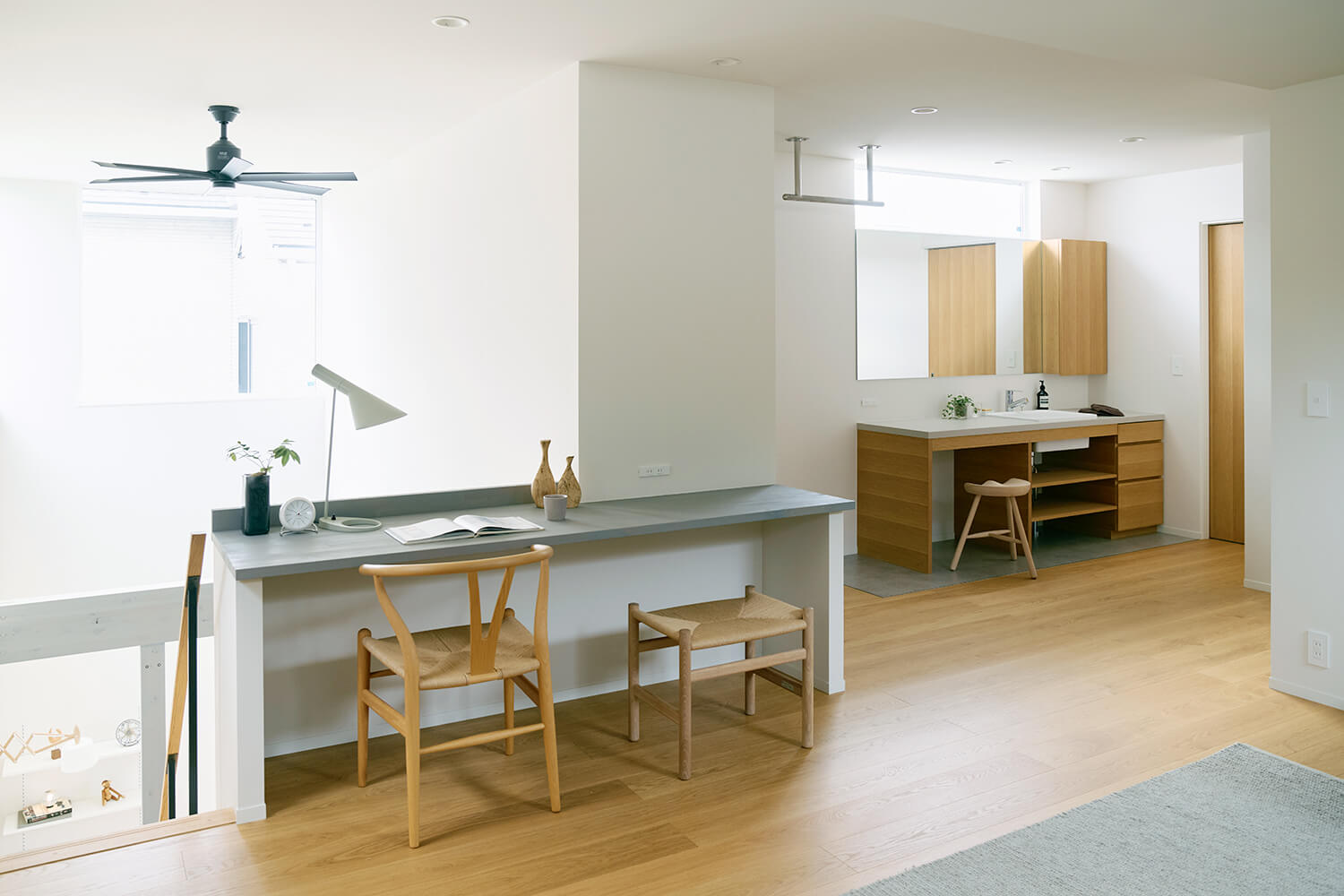 またYさん夫妻は「TIMBER YARDらしい上品ですっきりとした北欧テイストの住まいを維持するため、収納家具を買って置く必要がないようにしたい」と要望したという。そのため1・2階共に、主となる居室から死角になる位置に大容量のファミリークローゼットを造作し、収納量を十分確保。オークのフローリングに珪藻土クロスというナチュラルスタイルの空間をすっきりと保ち、厳選した北欧デザインの置き家具をコーディネートして魅せる空間に。ご主人が好きなアートや絵画、奥さまが集める雑貨など、好みのものや家族の思い出を壁に飾ったり、玄関からLDKまで続く長いフローティングシェルフに並べたり。季節ごとの演出や旅の記憶を重ねていくのがこれからの楽しみだそう。