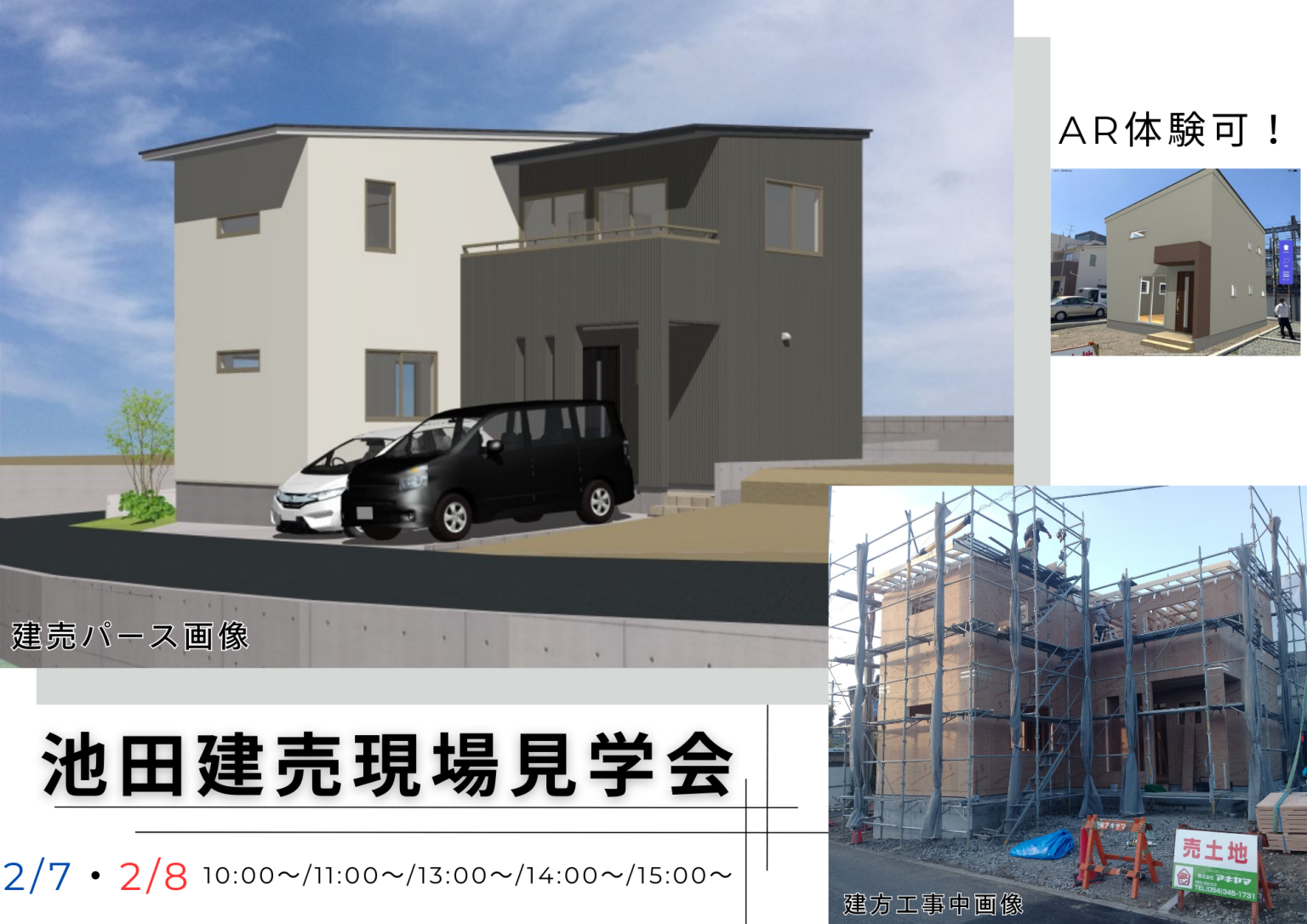 建売見学では完成後に見えなくなる構造部分を確認でき、AR体験では更地に住宅が建った時のイメージをつかむことが出来ます。同日でのご参加はもちろん、別日程でそれぞれのご案内も可能でございます。