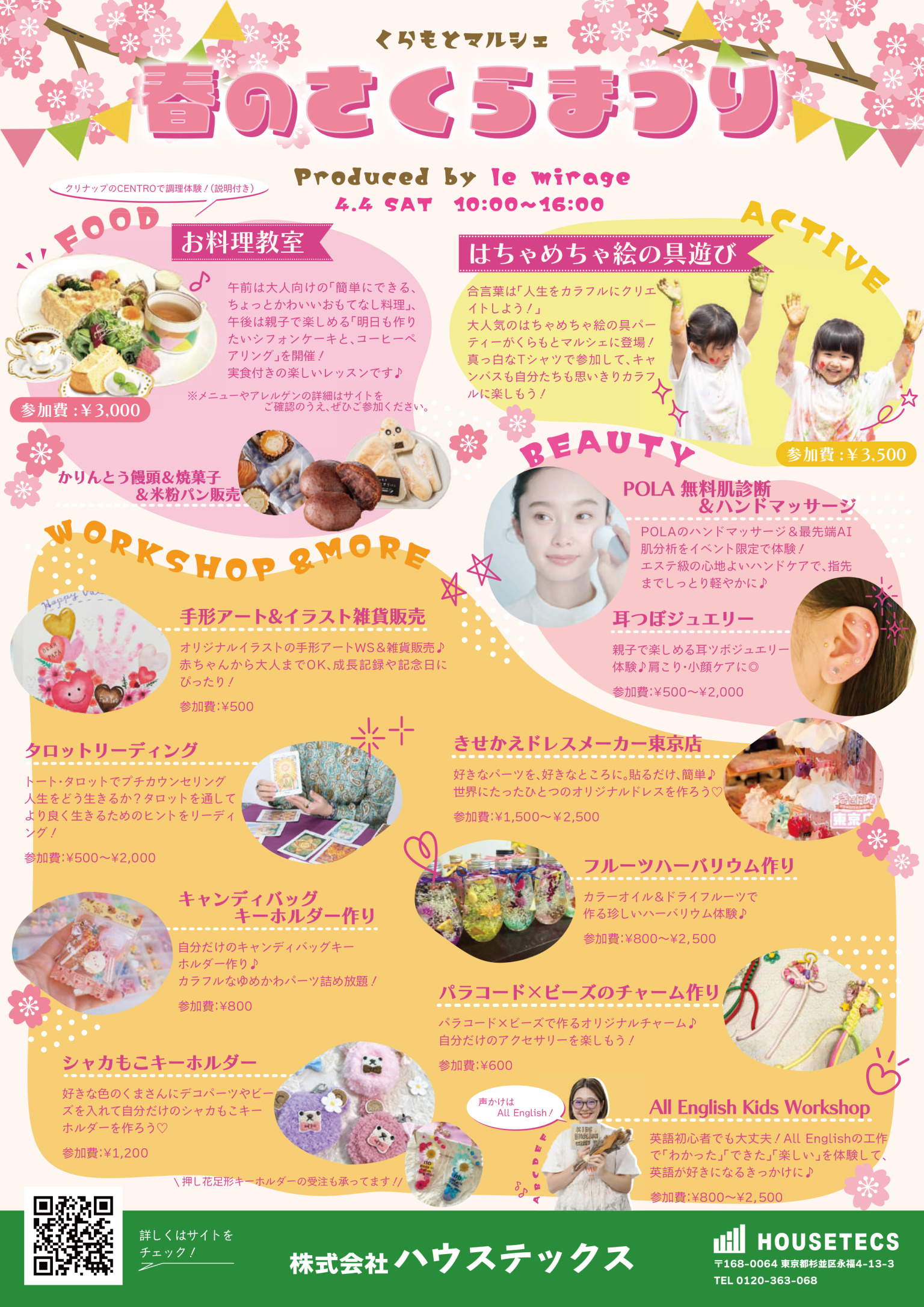 住まいに関する[ハウステックスセレクトの“今気になる”]お役立ちセミナーや相談会はもちろん、食と美と健康の、ワークショップ&体験のコーナーが目白押しです!お菓子やグッズ販売など盛りだくさんのマルシェです♪