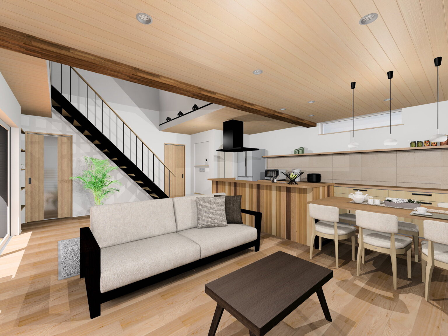 約6m×6mの広さには吹抜けとリビング階段があり、